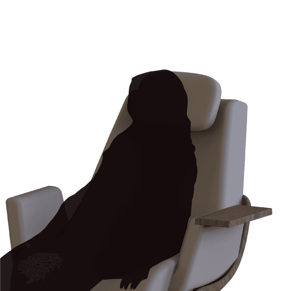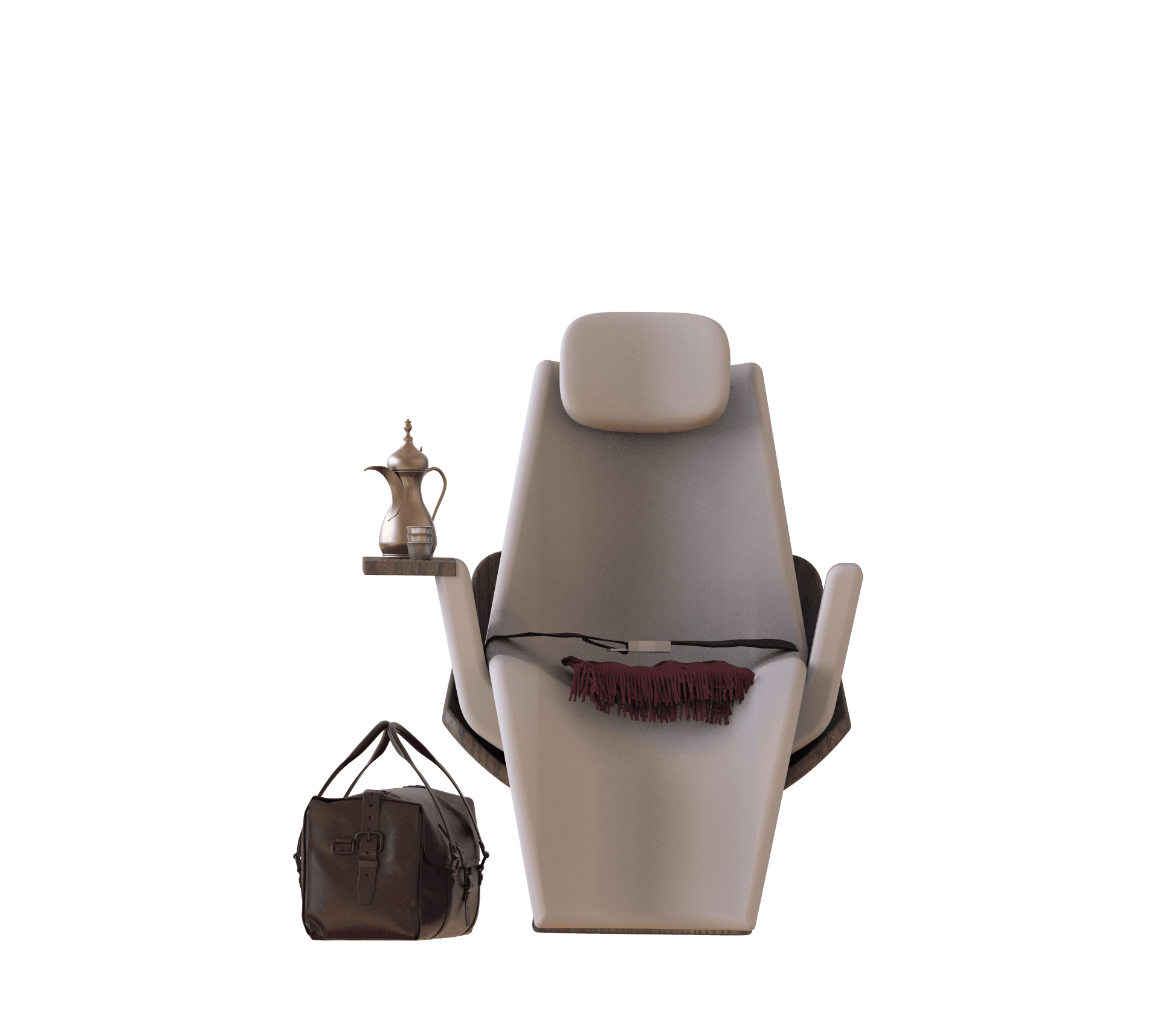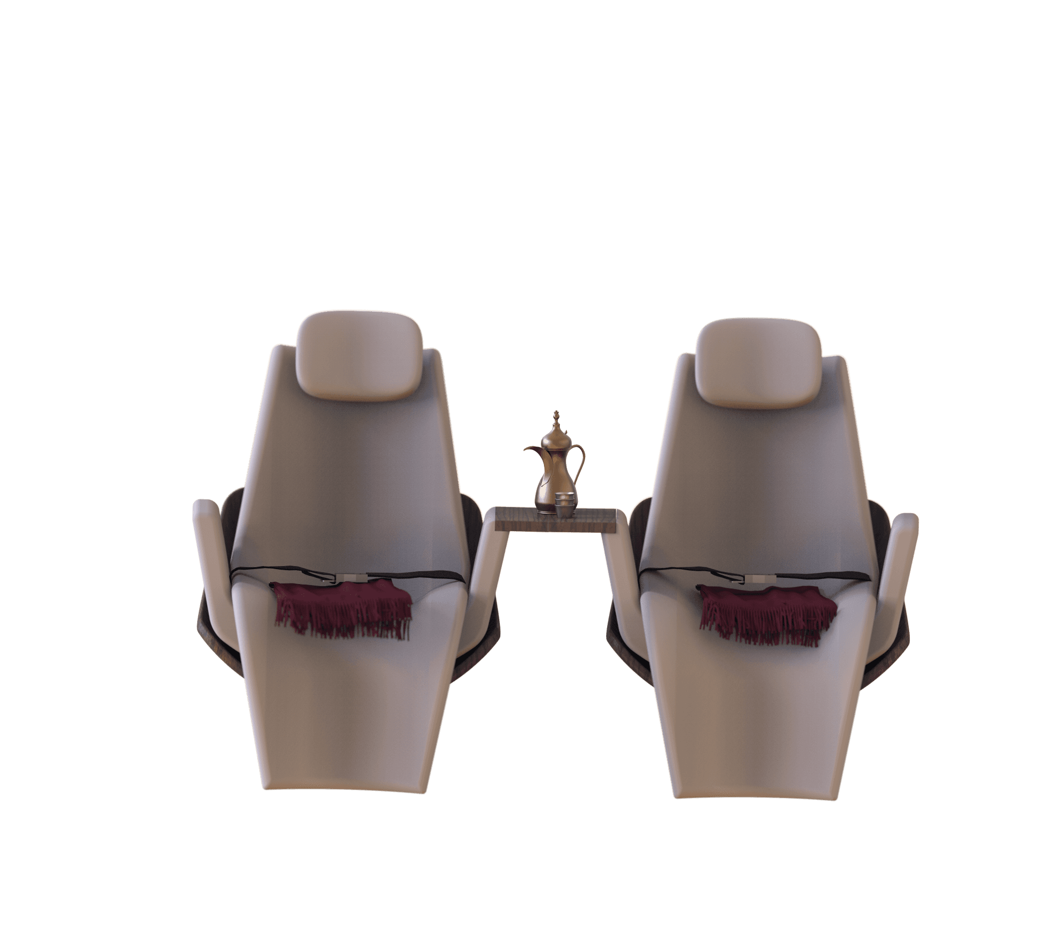 Design a train chair that aligns with the traditional sitting posture, providing comfort to users. Incorporate features reflecting the customary hospitality in Arab culture.